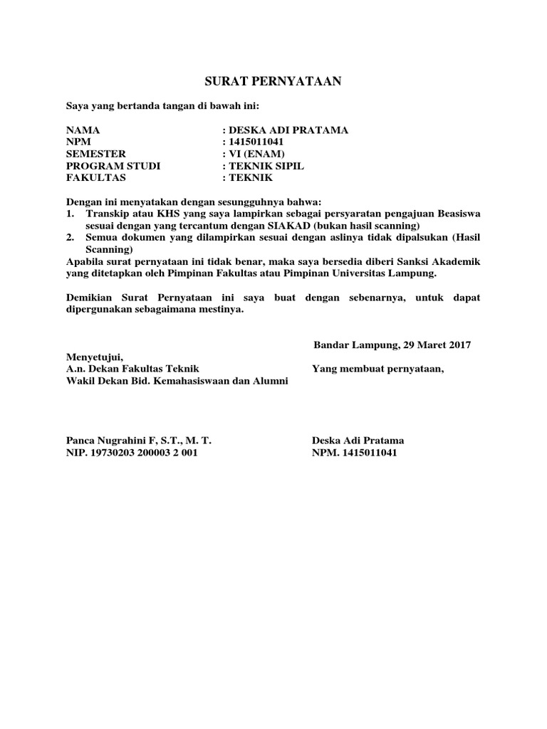 Demikian pernyataan ini saya buat dengan sebenar benarnya tanpa ada paksaan. Kak untuk beasiswa jalur kurang mampu, apakah surat pernyataan penghasilan harus diisi keduannya ? Keabsahan dokumen ( dokumen asli ) 3. Surat ini dibuat untuk memperkuat keaslian dari dokumen tertentu. Contoh surat keabsahan dokumen import barang dibuat untuk memenuhi prosedur import custom clearance di indonesia di sertai juga surat. Contoh surat pernyataan tidak menerima beasiswa lain. Surat pernyataan bahwa dokumen yang kita berikan absah dan benar adanya. Surat pernyataan penghasilan orang tua gabungan jika dibagi dengan anggota. Untuk mendapatkan file contoh surat permohonan beasiswa kepada bupati, gubernur, pemda yang tidak diproteksi dan bebas untuk diedit, silahkan anda kunjungi situs kami. Tidak memiliki tato bagi pria dan wanita, dan tidak boleh tindik bagi pria dan tidak boleh. Apabila ditemukan dan/atau dibuktikan adanya penipuan/pemalsuan atas informasi yang saya sampaikan, maka saya bersedia dikenakan dan menerima penerapan sanksi berupa pembatalan beasiswa gya. Biasanya surat ini akan dijumpai jika membuat lamaran pekerjaan. Contoh surat pernyataan kebenaran dokumen surat pernyataan.